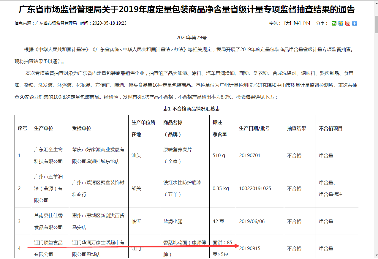 近日,广东省市场监督管理局官网发布关于2019年度定量包装商品净含量省级计量专项监督抽查结果的通告。通告内容如下:根据《中华人民共和国计量法》《广东省实施<中华人民共和国计量法>办法》等相关规定,我局开展了2019年度定量包装商品净含量省级计量专项监督抽查。现将抽查结果予以通告。