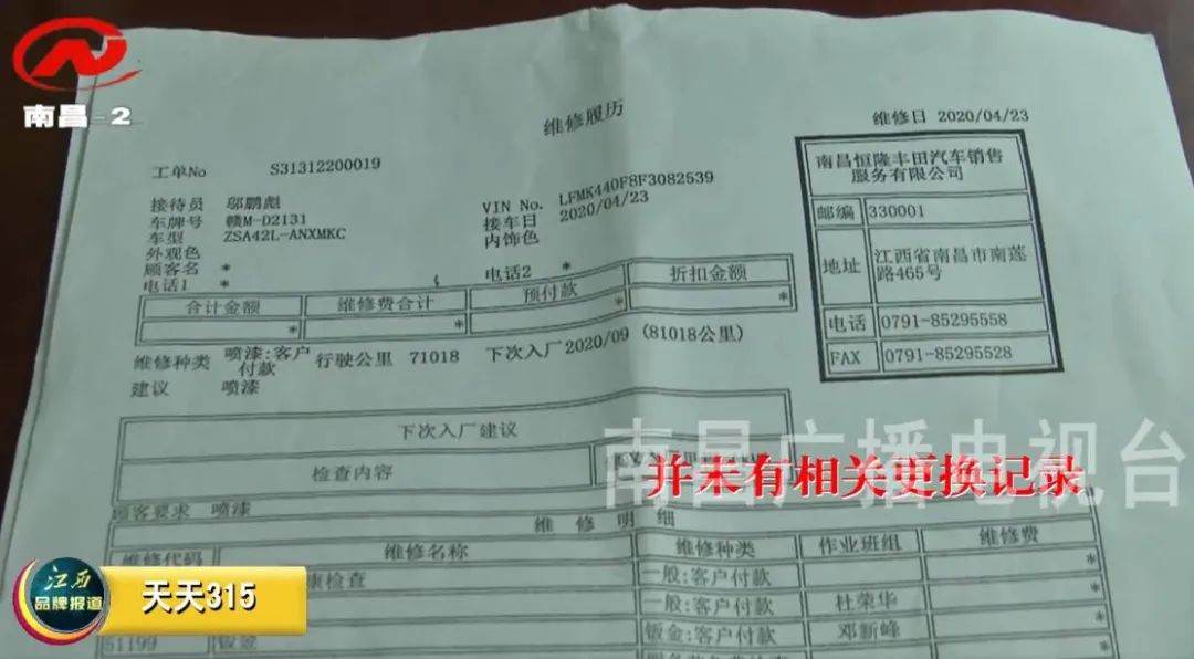 4月20日,陈先生的白色丰田汽车发生事故后,通过保险理赔将车送到位于南莲路的恒隆丰田4S店维修。然而当陈先生去提车时,却没有收到任何维修清单。当陈先生再次找到恒隆丰田4S店工作人员索要相关单据,并对爱车检查后,发现了许多问题。