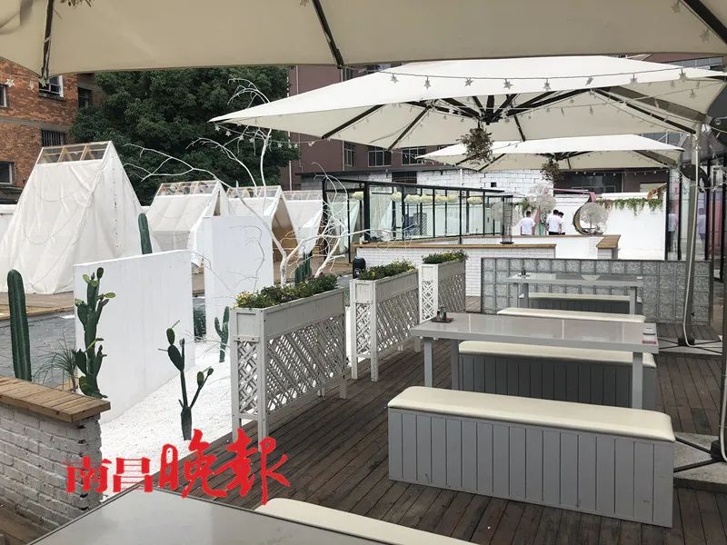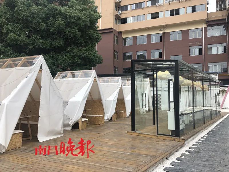 记者随后来到了这家“隐餐厅”,只见该餐厅位于青山湖区解放西路阀门厂社区里,进入该餐厅的院子后发现,院子的面积达到上百平米,里面建造了各式各样的临时建筑,大致都为网红风格,其中包括玻璃房和木质帐篷等用餐区域,颜色也以白色系为主。