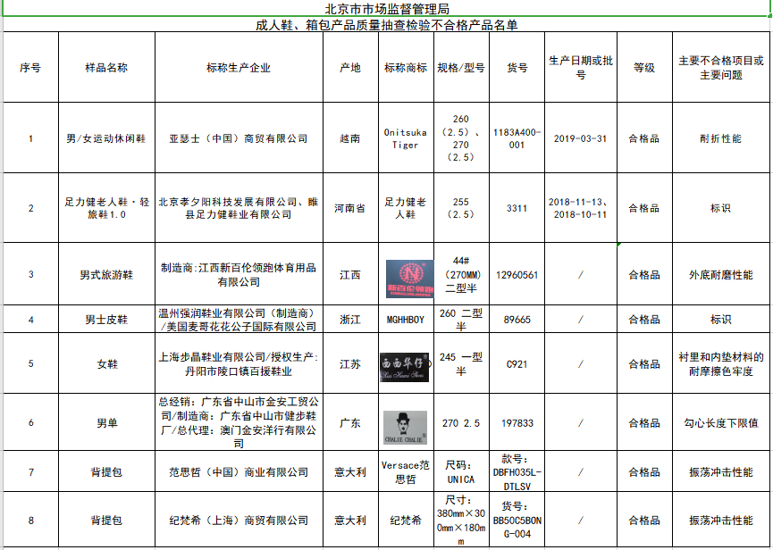 北京市市场监管局同时发出风险提示,在本次成人鞋、箱包产品质量抽查检验中,发现部分产品存在质量问题且通过产品标称的企业地址及联系方式无法与标称生产企业取得联系,建议消费者谨慎购买下列标称企业的产品。
