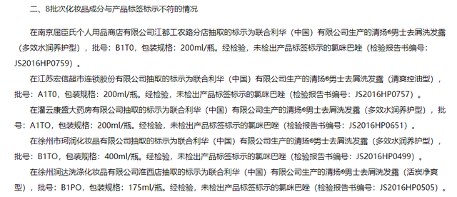 通报还称,清扬男士去屑洗发露活炭净爽型(批号1808150308)原料“十二烷基醇醚硫酸钠”称量记录为2100kg,投料记录为2060kg,前后相差较大,且未作情况说明。