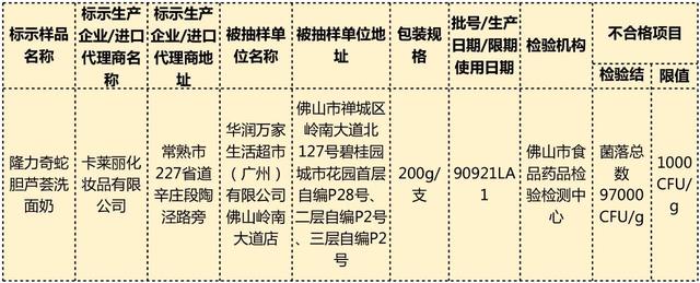 隆力奇也在此次抽检中被点名。根据17批次化妆品不合格通告,一批次华润万家生活超市(广州)有限公司佛山岭南大道店销售的、标称卡莱丽化妆品有限公司生产的隆力奇蛇胆芦荟洗面奶(批号90921LA1),菌落总数检出值为97000 CFU/g,标准要求限值为1000 CFU/g,超标96倍。