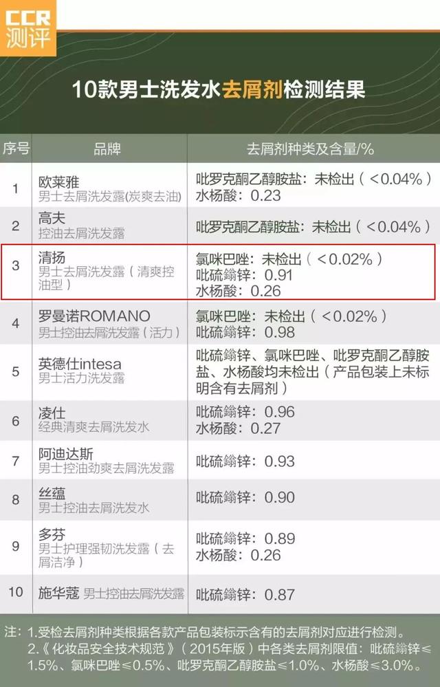 根据2019年2月《消费者报道》向第三方权威检测机构送检的10款热销男士洗发水对比测试结果显示,清扬男士去屑洗发露未检出标签标识的去屑剂氯咪巴唑。