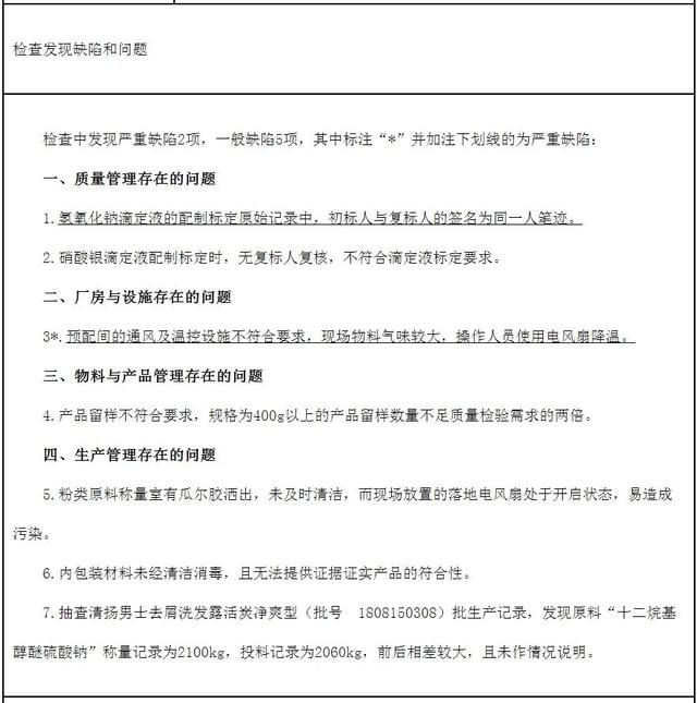 而早在2018年9月,国家药品监督管理局官网发布的对联合利华(中国)有限公司飞行检查通报显示,该公司在生产企业监督检查中发现严重缺陷2项,一般缺陷5项,在质量管理、物料与产品管理和生产管理方面均存在漏洞。