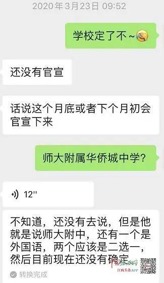 3月23日,罗先生再次向华侨城万科询问学校是否确认,工作人员给的答复是还没有官宣,应该会在江西师大附中和南昌外国语学校中二选一。