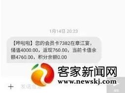 今年1月,她经朋友推荐,参加了赣州俊海餐饮管理有限公司的新年充值活动,并通过扫描支付的方式向该公司支付了4000元充值金,获赠该公司旗下章江宴餐厅消费金760元以及2份4人套餐券(每份价值299元)。
