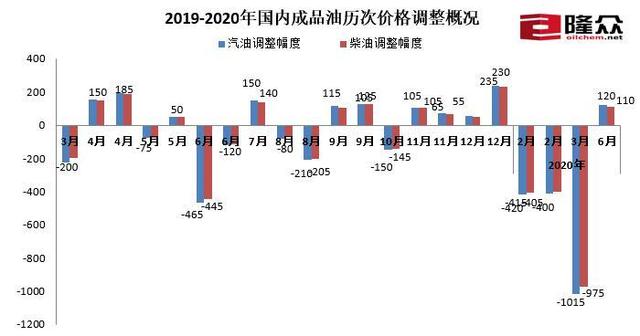2019-2020年国内成品油历次价格调整概况。数据来自隆众资讯