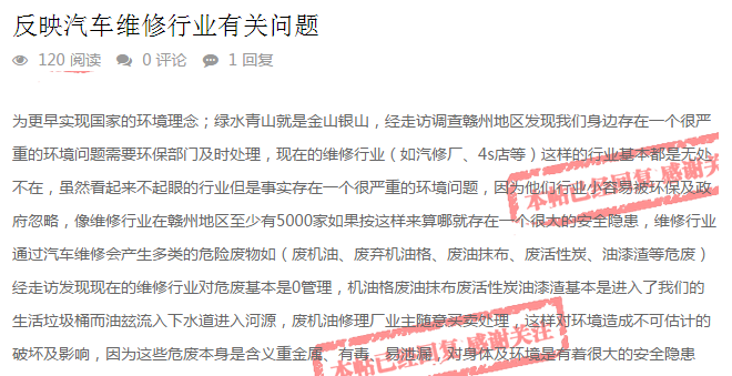 该网友称信丰县有汽车维修厂 随意买卖处理废机油 破坏生态环境