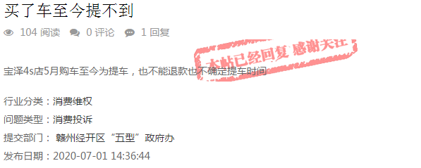 经区市场监管分局了解核实,5月20日,发帖人杨某在赣州宝泽汽车销售服务有限公司订购1台宝马汽车,已支付首付款六余万元,双方约定在15-20个工作日交车。受新冠肺炎疫情影响,宝泽汽车公司资金出现问题,暂时无法从银行取出车辆合格证,因此,不能及时交车。