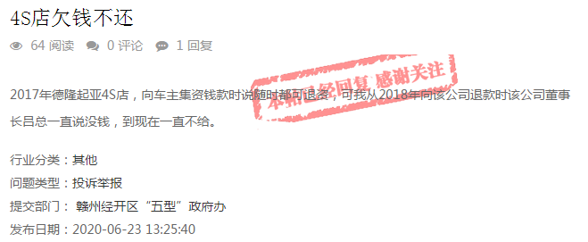 德隆起亚4S店全称为赣州德隆汽车贸易有限公司,经营东风悦达起亚品牌汽车4S店,2016年12月15日推出“股东分红会员”活动,采取会员制形式以2000元一股吸引车友缴纳股本金,每股年分红比例23%,其中20%以现金发放,3%发放维修金,会员每年包含空调蒸汽清洗3次共计480元,更换氮气1次计100元,四轮动平衡1次计100元,每月4次洗车年共计960元,合计年其他收益1640元。德隆起亚4S店承诺“自愿加入,自主退出”“合伙人分红会员在提出申请后七个工作日退回相应金额的股本金(现金或转账)”。发帖人2017年向该公司投入1万元,至今未收回投资款。