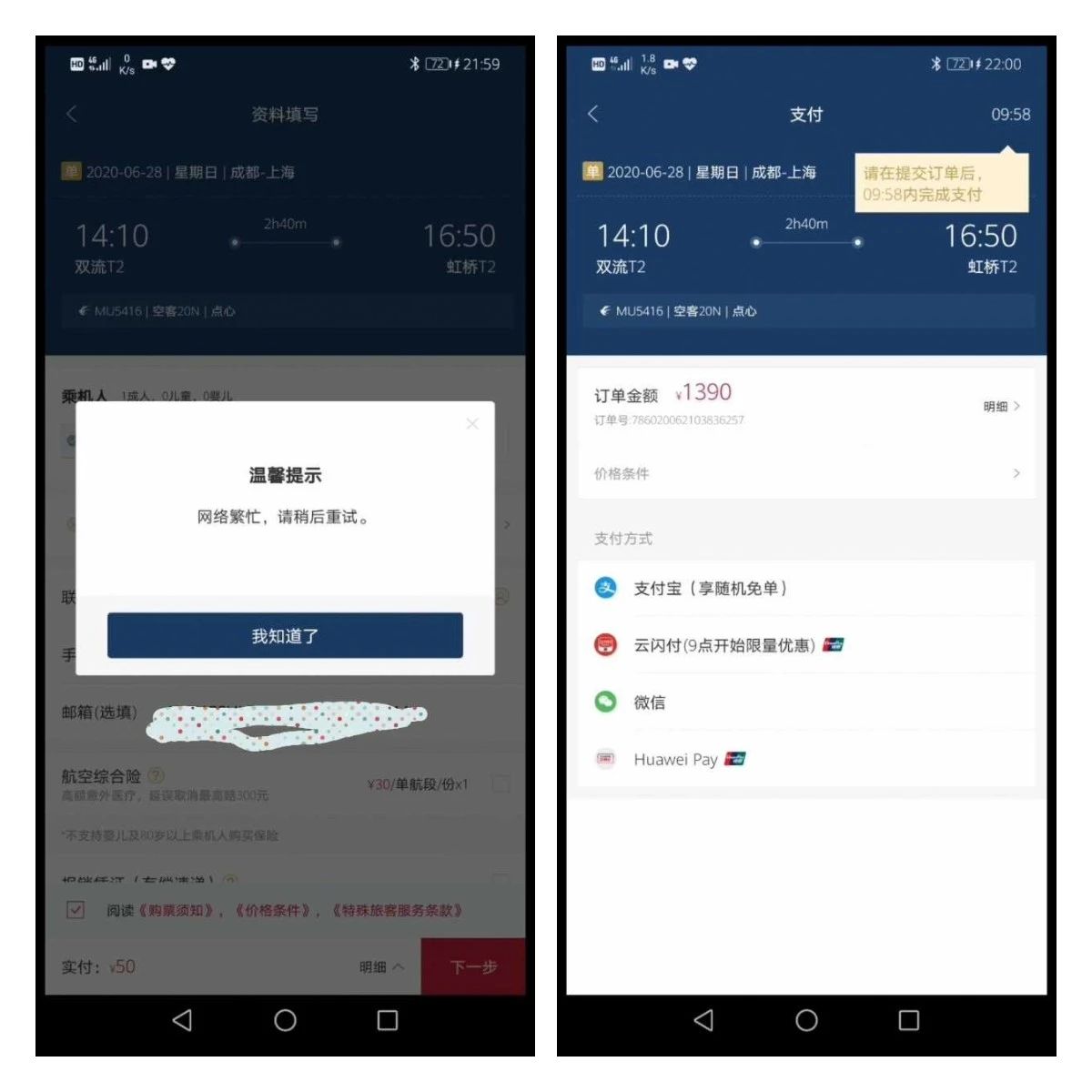 这位用户给《消费者报道》提供了两张相隔1分钟的截图,左图使用“随心飞”兑票只需支付机场建设费50元,但这位用户表示自己尝试兑票十几次,均显示“网络繁忙”,一直无法跳转到支付页面;而右图是同一航班按常规流程来购票,可直接跳转到1390元付款界面。他补充道,这样的情况在多个航班都存在,尤其在显示经济舱余票紧张的情况下,兑换“随心飞”基本都显示网络繁忙。