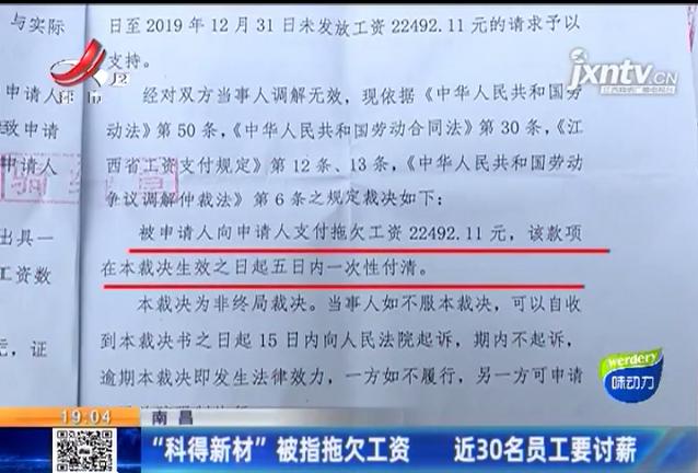 科得新材原员工王杰:科得新材欠我们2019年1月到7月工资以及12月份的工资,(我个人)合计金额是41052.07元,仲裁结果就是按照要求支付我们员工工资。
