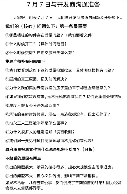 尤其,在7月7日的维权当中,业主们进行了充分的沟通准备,但项目的总负责人依旧没有现身回应。