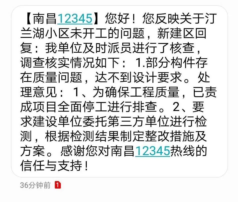可以看到,12345调查核实的情况是:部分构件存在质量问题,达不到设计要求。并需要根据第三方检测单位检测结果制定整改措施及方案。