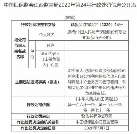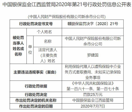 中国经济网北京7月15日讯 银保监会网站昨日公布的江西监管局2020年第21号行政处罚信息公开表(赣银保监罚决字〔2020〕21号)显示,中国人民财产保险股份有限公司(简称“人保财险”)新余市分公司存在以下2宗违法行为:利用保险代理人以虚构保险中介业务方式套取费用、未如实记录保险业务事项。依据《中华人民共和国保险法》第一百六十一条、第一百七十条,江西监管局对该分公司处以罚款25万元。