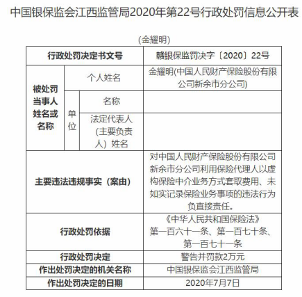 江西监管局2020年第22号行政处罚信息公开表(赣银保监罚决字〔2020〕22号)显示,金耀明对人保财险新余市分公司利用保险代理人以虚构保险中介业务方式套取费用、未如实记录保险业务事项的违法行为负直接责任。依据《中华人民共和国保险法》第一百六十一条、第一百七十条、第一百七十一条,江西监管局对金耀明处以警告并罚款2万元。