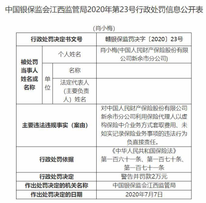 江西监管局2020年第23号行政处罚信息公开表(赣银保监罚决字〔2020〕23号)显示,肖小梅对人保财险新余市分公司利用保险代理人以虚构保险中介业务方式套取费用、未如实记录保险业务事项的违法行为负直接责任。依据《中华人民共和国保险法》第一百六十一条、第一百七十条、第一百七十一条,江西监管局对肖小梅处以警告并罚款2万元。