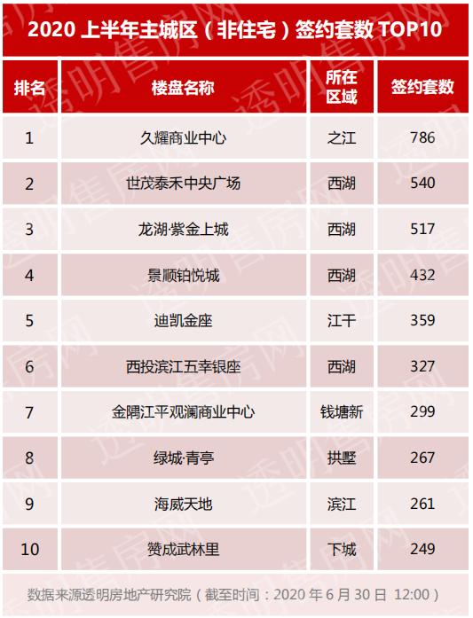 ▶ 杭州楼市2020年上半年成交排行榜主城区(非住宅)签约套数TOP2(世茂泰禾中央广场,数据来源透明售房网)