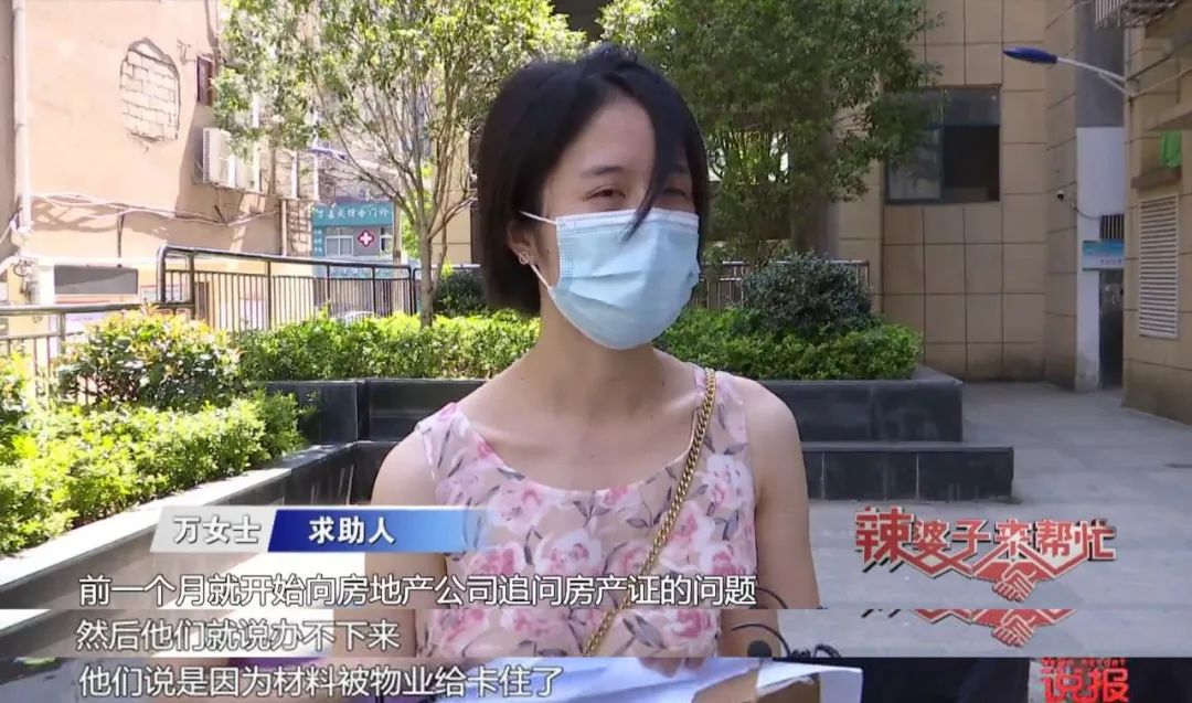 求助人万女士:前一个月就开始向房地产公司追问房产证的问题,然后他们就说办不下来,他们说是因为材料被物业给卡住了。