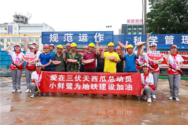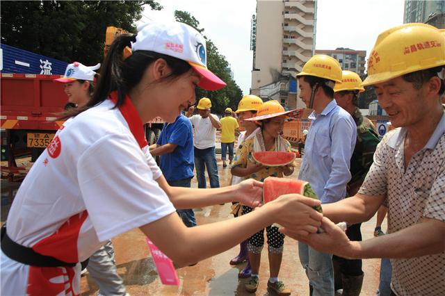 江西消费网讯 时值盛夏,骄阳似火,烈日炎炎。7月30日上午,南昌轨道交通集团有限公司小鲜鹭志愿者一行12人走进中铁五局一公司南昌地铁4号线丁公路南站,为正在高温下作业的一线地铁建设者送来了西瓜,并亲手为他们擦去脸上的汗水,将一块块肉质鲜美的西瓜送到每一位地铁建设者手中。