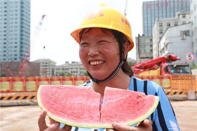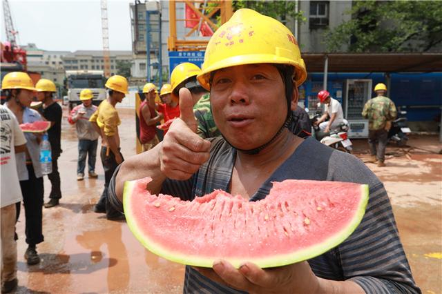 来自安徽巢湖的钢筋工何志强对记者说:“感谢活力四射的小鲜鹭志愿者为我们一线工人送来西瓜,在这炎热的夏日让我们的心里更加凉爽。”