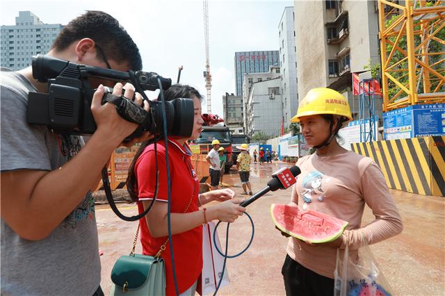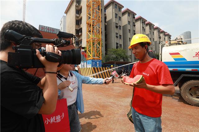 随着小鲜鹭志愿者一同来送清凉的还有南昌电视台、南昌日报、南昌晚报等媒体。在送西瓜现场,记者深入现场采访了刚下班的工人。