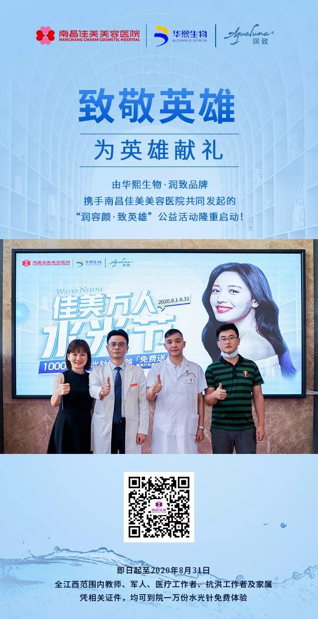在此次公益活动中,凡是教师、军人、医疗工作者、抗洪工作者及家属均可凭有效证件享受到免费水光针注射,更有多重好礼感恩相送,这是南昌佳美为江西英雄们献上的小小心意。