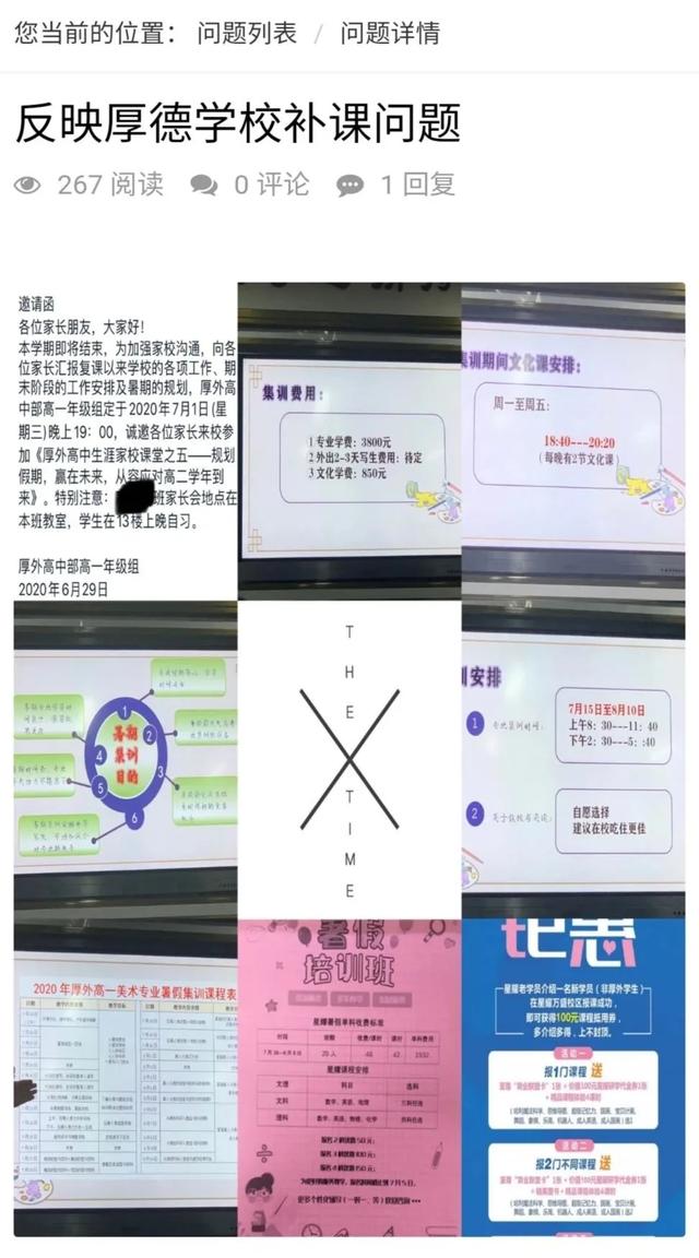 7月14日,区社管局就厚德学校暑假违规补课一事约谈了该校,责令其立即停止高一升高二年级的补课,退还已收取的费用,并向家长、学生做好解释说明。同时,要求其合理安排高二升高三年级的补课时间,不超过假期的三分之一。厚德学校表示将整改到位。