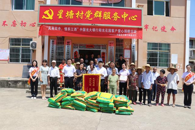 8月3日,光大银行南昌分行行长助理、上饶分行行长廖望一行来到鄱阳县古县渡镇为受灾村民送上募集的复合化肥。鄱阳遭受洪灾以来,光大银行南昌分行组织辖内机构迅速行动,多次组织抗洪救灾小分队来到鄱阳慰问,了解灾区实际需求,并第一时间启动应急响应机制,开通绿色审批通道,在7月20日仅仅用一天时间就完成各项审批流程为鄱阳县提供一亿元救灾应急贷款,展现了光大速度、责任与担当。