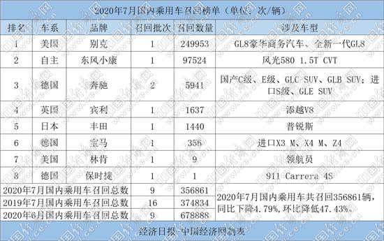 7月的最后一天(7月31日),上汽通用一起涉及近25万辆别克汽车的召回,成为当月数量最大召回,大幅推高召回市场规模。但整体来看,7月国内乘用车召回市场仍处低位运行,共有8个品牌累计发布9起召回,共计召回汽车356861辆,同比小幅下降4.79%,环比降低47.43%。