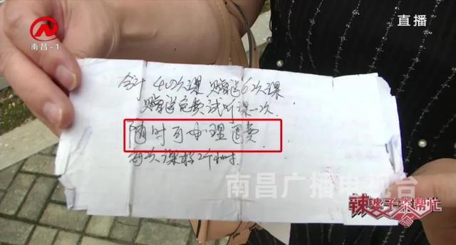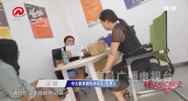 在周女士提供的收据单背面,记者看到,上面明确写着“随时可办理退费”,但为何该机构拒绝履行承诺呢?记者也陪同求助人周女士,来到中大教育朝阳洲校区协商相关问题,但中大教育朝阳洲校区负责人晏琼表示要找邹琦林本人解决问题!