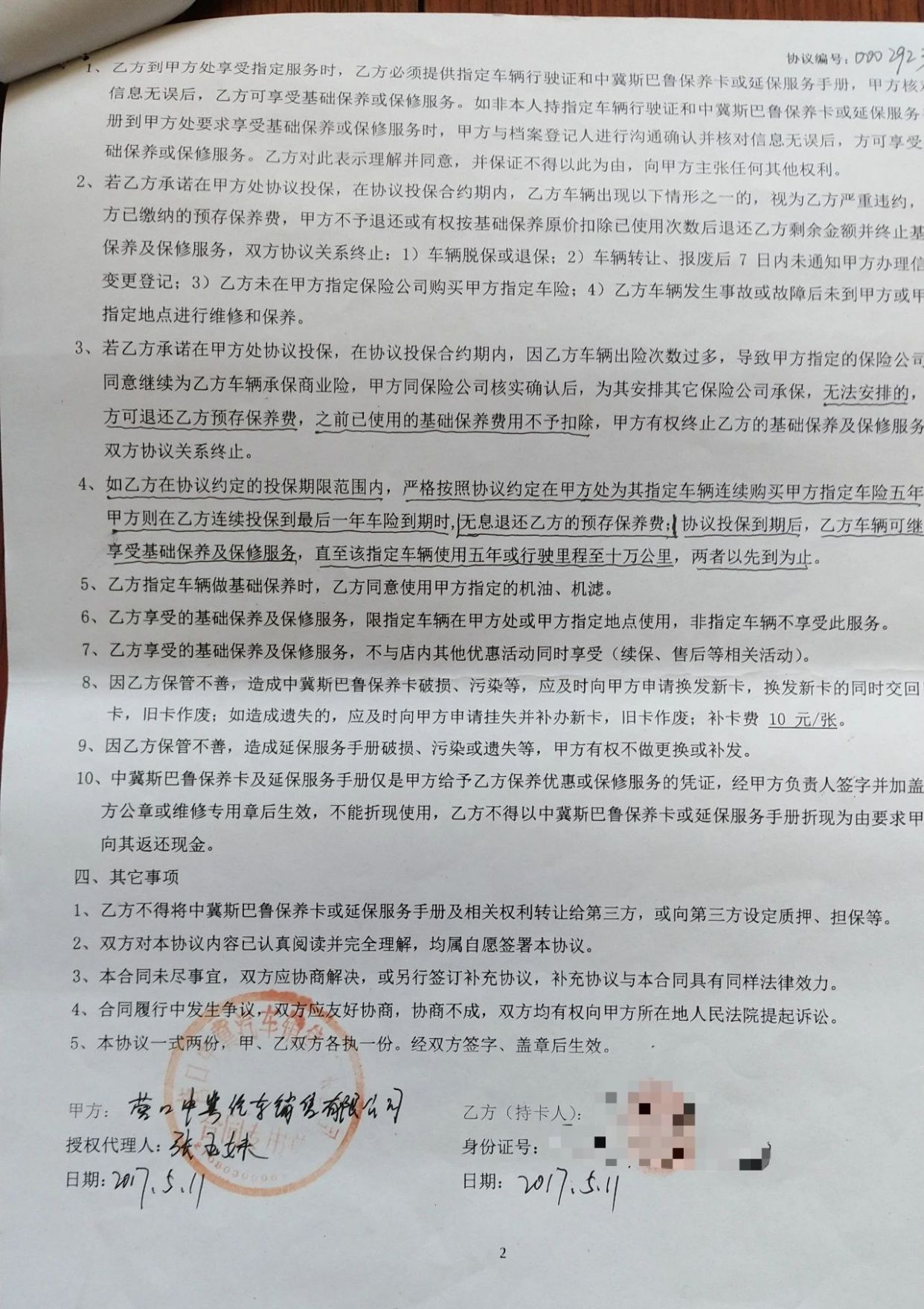 ▲保养协议注明5年期满后向车主原额返还保证金