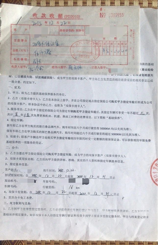 ▲张先生的续保保证金收据和保养协议