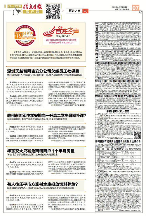 截至8月16日17时,大江网《百姓之声》栏目组收到吉安市、南昌市、赣州市等地有关部门的回应,其中,上犹县不动产登记中心、井冈山经开区人社局、乐平市众埠镇政府等单位回应了百姓反映的问题。《百姓之声》栏目组对积极回复百姓诉求的单位表示感谢。