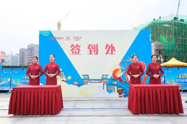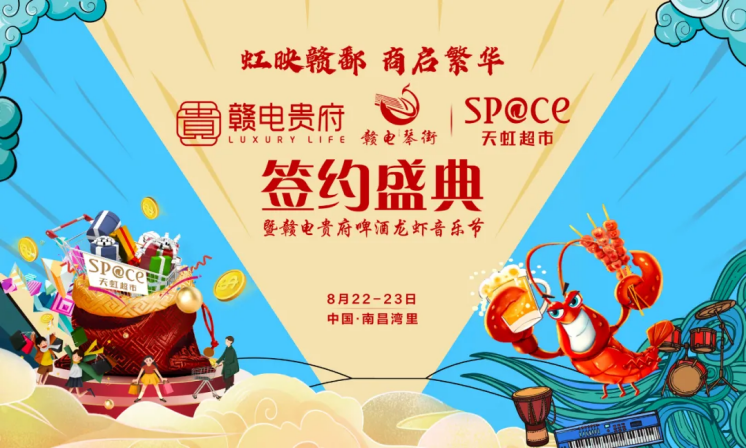 潮鸣湾里,巨擘联袂,8月22日,注定是个非凡的日子,赣电贵府·琴街—天虹sp@ce超市战略意向签约盛典暨啤酒龙虾音乐节在这一天隆重登场。