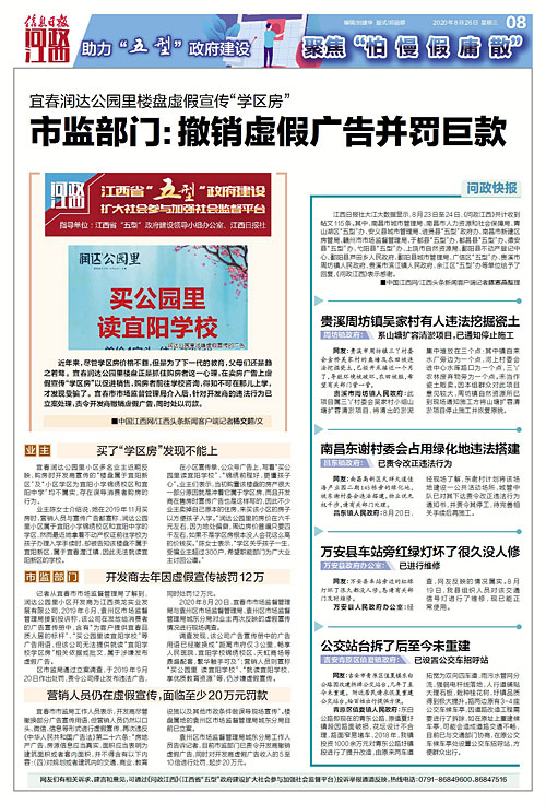 近年来,尽管学区房价格不菲,但是为了下一代的教育,父母们还是趋之若鹜。宜春润达公园里楼盘正是抓住购房者这一心理,在卖房广告上虚假宣传“学区房”以促进销售,购房者前往学校咨询,得知不可在那儿上学,才发现受骗了。宜春市市场监督管理局介入后,针对开发商的违法行为已立案处理,责令开发商撤销虚假广告,同时处以罚款。