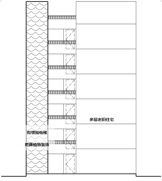 图示3:新增电梯外墙采用爬藤植物装饰,可增加垂直绿化提升小区环境