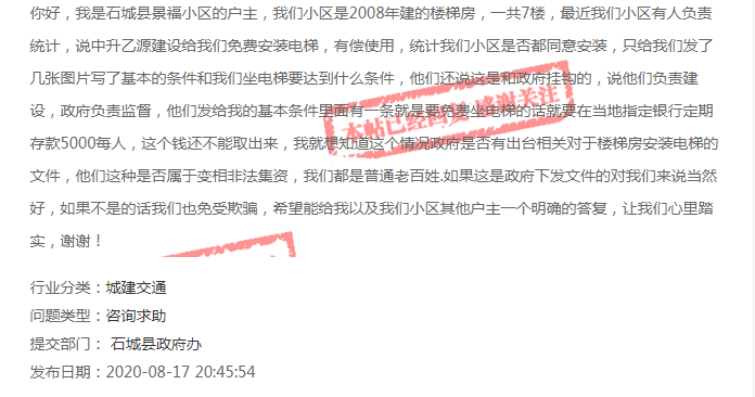 信访人反映其为石城县景福小区业主,近日中升乙源建设工程有限公司称可以为其小区“免费安装电梯,有偿使用”,信访人咨询此项目是否和政府挂钩,政府是否有出台有关楼梯房安装电梯的文件。
