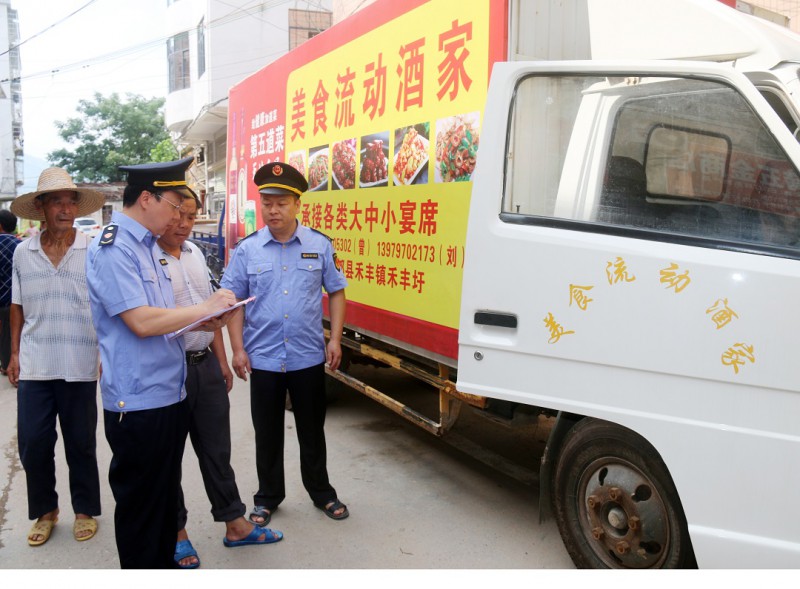 图:8月10日该局执法人员正在一乡镇对流动酒家进行监管