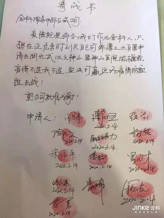 2月3日,当得知金科集团要组建先锋志愿者队驰援火神山医院后勤服务时,高勇便第一时间报了名,并写下了请愿书:“我自愿前往湖北武汉火神山医院做志愿者。疫情不退我不退……”