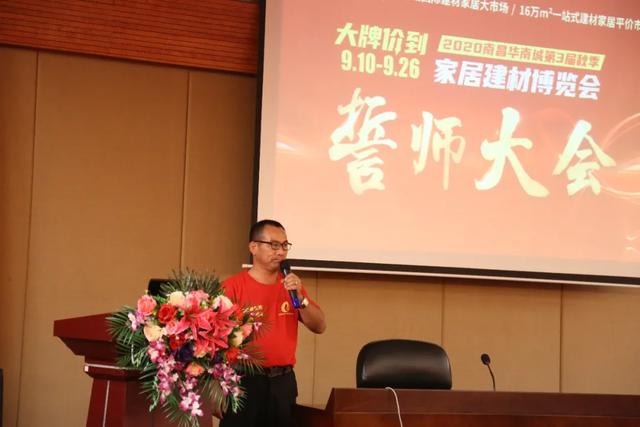 南昌华南城商业管理有限公司市场运营总监朱祖文、南昌华南城商业管理有限公司7号馆市场运营负责人万利群、红谷滩建材商会会长蔡恒金出席誓师大会,7号馆家具建材市场商户共计100余人参加。