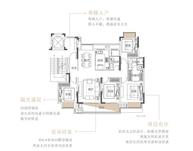 科学配比家中的空间分配,南北通透、更高的空间利用率之外,兼顾全家人对阳光的向往,四开间朝南规划,为阳光与清风留足更多空间,生活时刻流转清新的味道。给退休在家的老人、纵横名利场上的当家人、尚在牙牙学语的稚子,铺陈温暖底色。
