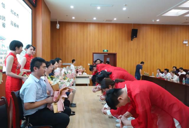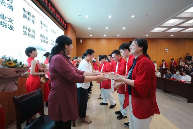 颁奖结束后,庄严的拜师仪式拉开帷幕。拜师仪式分为学生献花、学生行三拜揖礼、老师回赠《中医四大经典》、全体师生宣读中医人誓词等环节。拜师仪式简单、庄重,表达了学生对老师传道授业的敬重之意,也坚定了学生走好中医药之路的初心,增强了他们传承弘扬中医药文化的使命感。