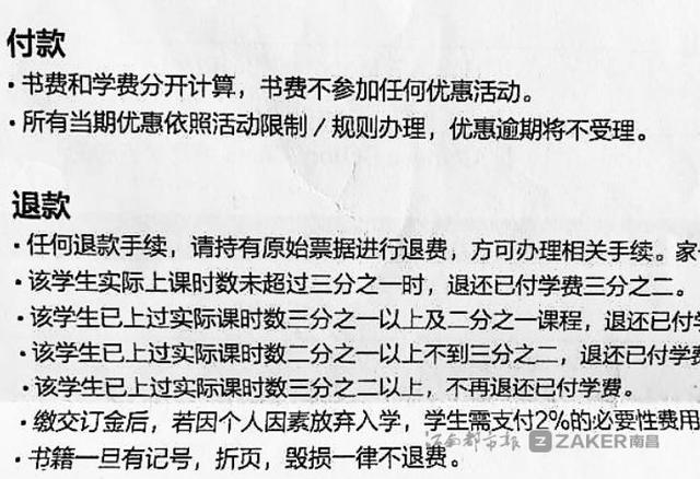 " 我从去年底就开始要求退款,到现在都没有得到处理。" 家长吴女士称,学校负责人以各种理由推诿。" 按照合同是可以退款的,很多都没有上到三分之一的课程,但我们还接受了扣除三分之一费用的退款方式。" 吴女士向记者提供的弋果美语报名合同中,退款一项清楚写明:" 该学生实际上课数未超过三分之一时,退还已付费用三分之二。"