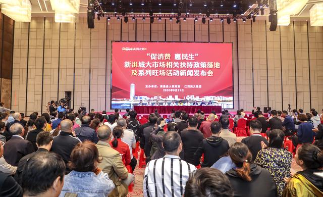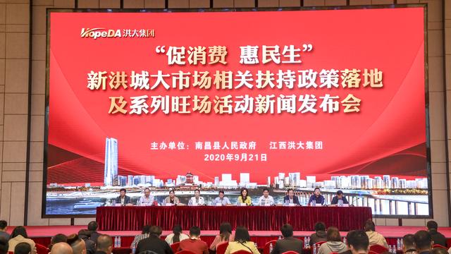 9月18日,在南昌县发改委主任王光华、县商务局局长王曦婷、县商务局副局长王燕以及政府其他职能部门负责人,洪大集团党委书记余小玲、总经理陈立群及其他高管和员工、商户、媒体代表的共同见证下,“促消费 惠民生”新洪城大市场相关扶持政策落地及系列旺场活动新闻发布会正式召开。