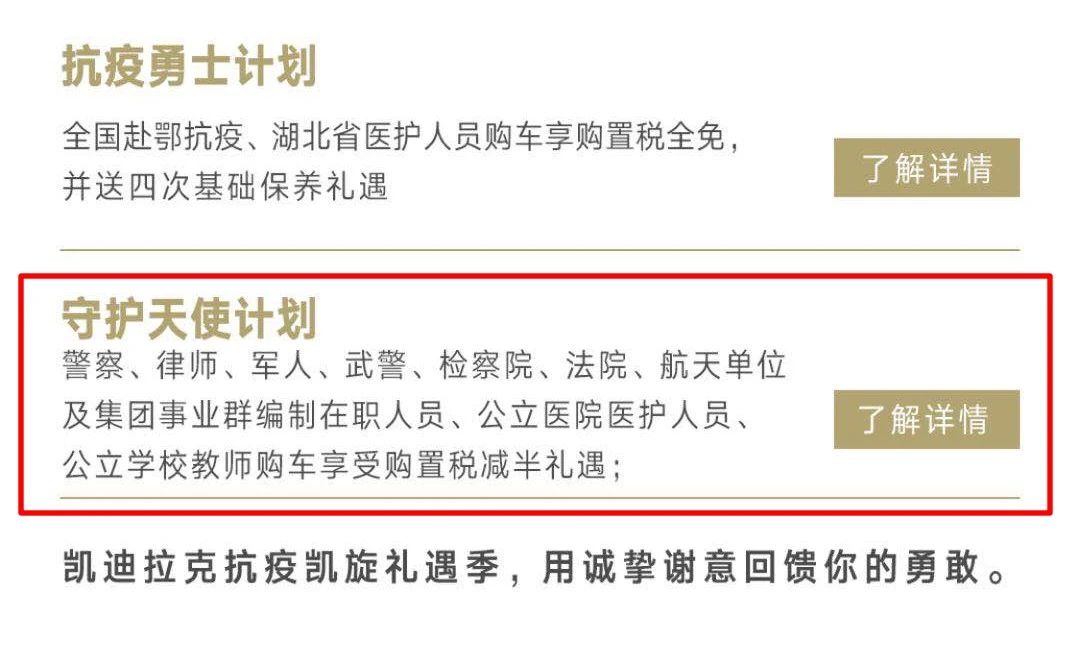 牛女士参加的优惠活动,是上汽通用凯迪拉克品牌在今年4月8日推出的“抗疫凯旋礼遇季”活动,有效期至今年6月30日,其中的“守护天使计划”规定,公立医院医护人员可以获得购置税减半的优惠。