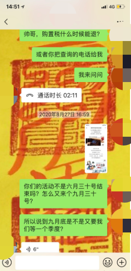 然而,购车将近4个月后,牛女士仍未收到购置税的退款。“我联系过4S店销售人员很多次了,一开始说到了6月30日活动结束后会依次打款,结果7月中旬的时候又说要等到这一个季度过去后才能打款,9月初的时候又说不清楚具体的退款时间。”牛女士说道。