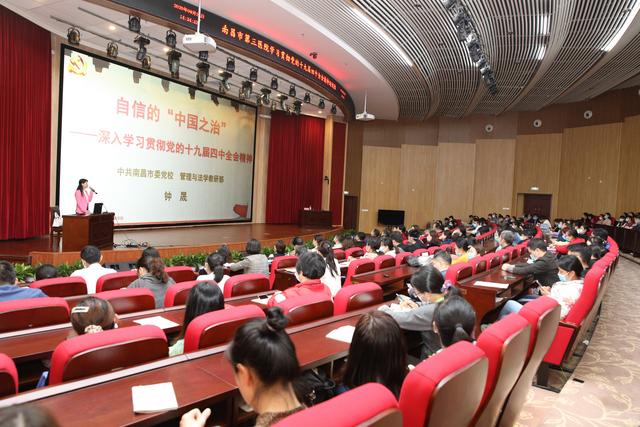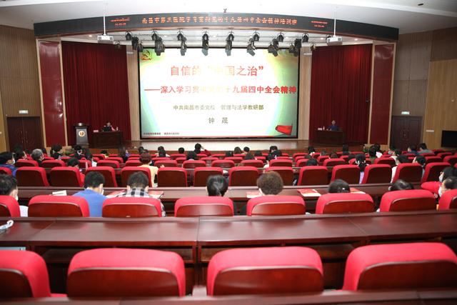 9月25日下午,南昌市第三医院在朝阳院区多功能会议厅举办学习贯彻党的十九届四中全会精神培训班。特邀中共南昌市委党校管理与法学教研部主任副教授钟晟同志作《自信的中国之治——深入学习贯彻党的十九届四中全会精神》专题讲座。院党委书记孙太平同志主持,全体院领导班子成员出席会议,全院党员、发展对象、入党积极分子约200余人参会。