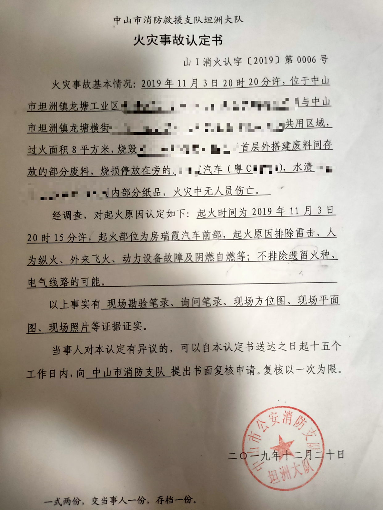 12月20日,中山市消防救援支队坦洲大队出具了火灾事故认定书,指出“起火部位为汽车前部,起火原因排除雷击、人为纵火、外来飞火、动力设备故障及阴燃自燃等”“不排除遗留火种,电气线路的可能”。