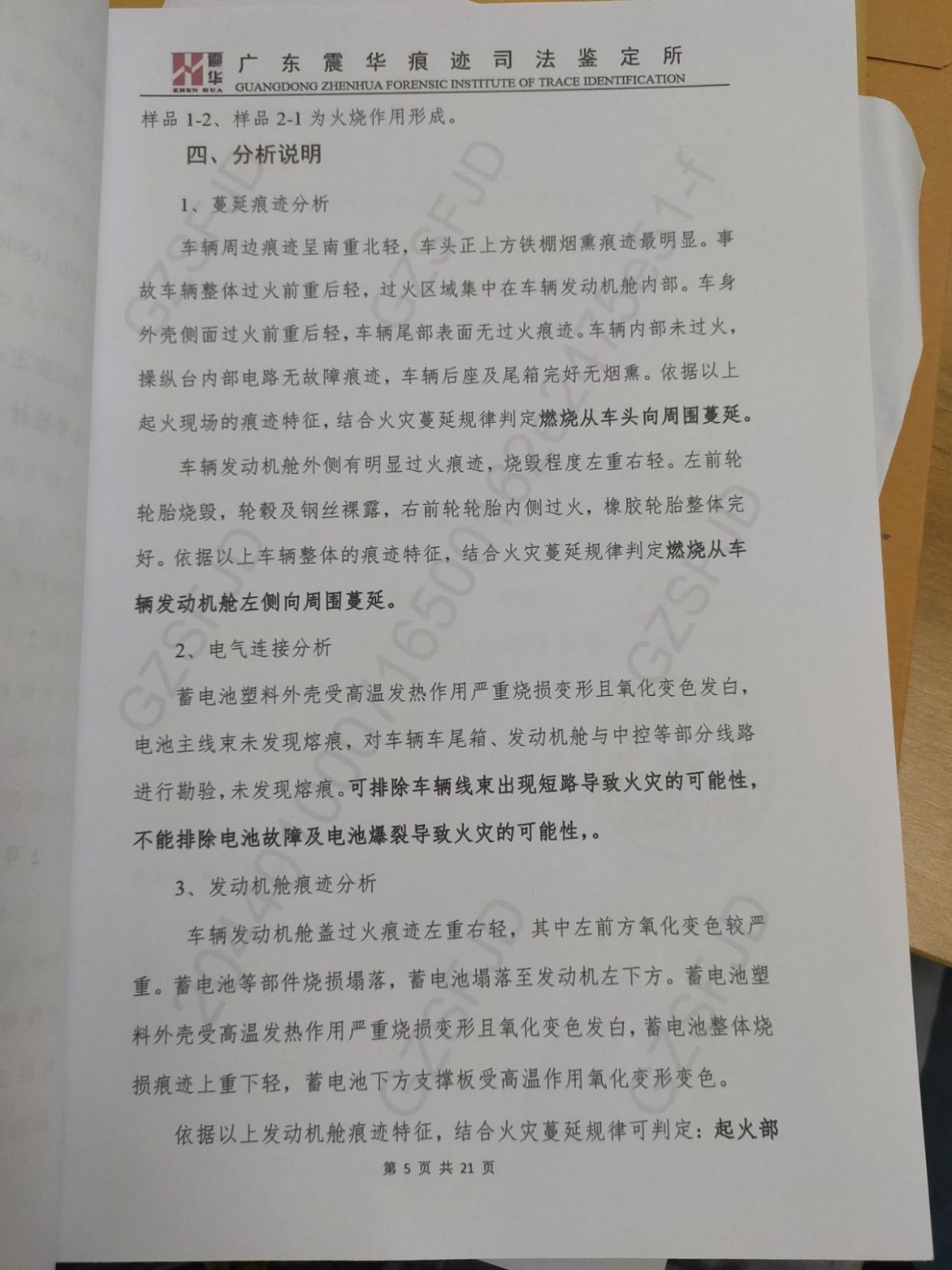 然而,第三方鉴定机构却对汽车起火原因给出了截然相反的结论。今年6月,广东震华痕迹司法鉴定所出具了关于房女士汽车起火原因的司法鉴定书,鉴定书指出“燃烧从车辆发动机舱左侧向周围蔓延”,鉴定起火原因为“发动机舱左侧蓄电池因老化等因素导致内部故障,整体过热燃烧,从而导致火灾。”